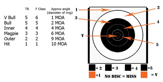 NRA full-bore targets have five scoring zones, ranging from 1 to 5 points. Inside the bull (5 points) is a smaller "V" bull zone, used to determine ties or, in some cases, awarded 6 points.