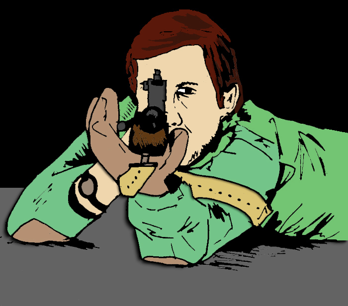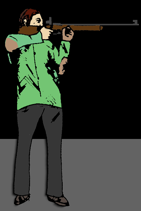 In two handed shooting, an often used stance has the left foot pointing in the direction of the target; the right foot is to the rear, slightly further apart than the width of the shoulder. This is demonstrated in the diagram below. This position is referred to as the Weaver Stance, after an American Deputy Sheriff.